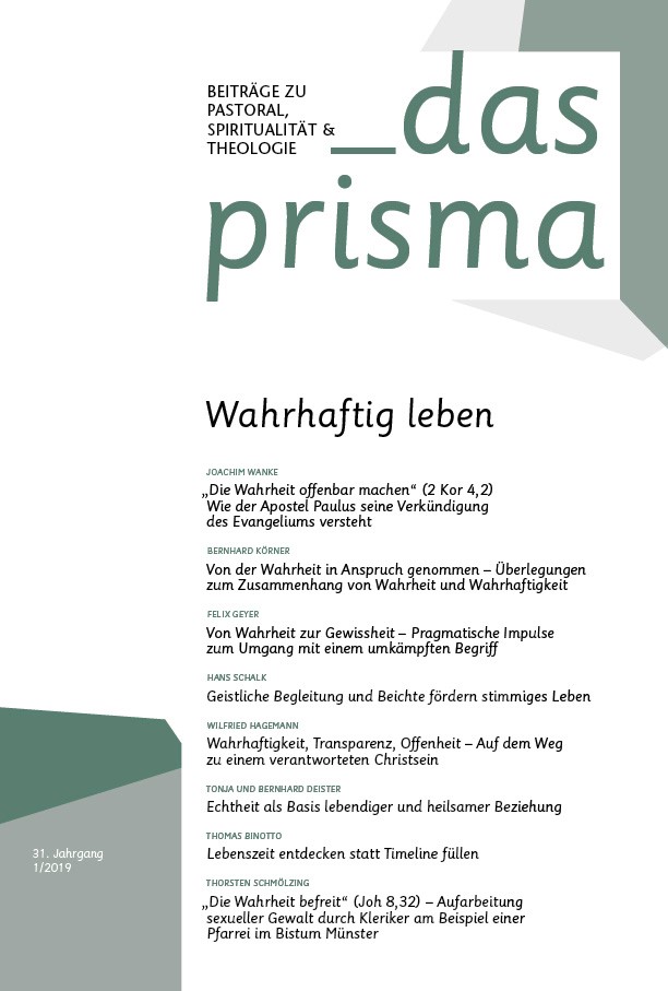 Beiträge zur Thematik bietet diese Ausgabe, wobei vielfältige Aspekte in den Blick kommen. Zeigt der Bischof und Exeget Joachim Wanke anhand von Paulus die Tiefendimension der Wahrhaftigkeit auf, so wählt der Dogmatiker Bernhard Körner einen systematischen Zugang zum Zusammenhang von Wahrheit und Wahrhaftigkeit und darin auch zur Problematik des Relativismus in Bezug auf die Wahrheitsfrage. Felix Geyer, Sozialethiker in München, stellt im Blick auf den Wahrheitsbegriff den Pragmatismus vor. Der Redemptorist P. Hans Schalk zeigt auf, wie Geistliche Begleitung und Beichte ein Lernfeld sind, um stimmig vor Gott und vor anderen zu leben. Wilfried Hagemann stellt die Frage nach der Gewissensbildung in den Fokus seiner Überlegungen. Er erinnert dabei an das Zweite Vatikanum, das die Gewissensfreiheit des Einzelnen unterstreicht und im Gewissen die Stimme Gottes verortet. Das Ehepaar Tonja und Bernhard Deister stellt in einem gemeinsamen Beitrag zur „Echtheit als Basis lebendiger und heilsamer Beziehung“ den personzentrierten Ansatz Carl Rogers vor. Die Echtheit einer Person setze in gelebten Beziehungen Kräfte frei, die heilsam wirken. Wie die Radikalität der Nachfolge Christi zur Wahrhaftigkeit führt, diese Nachfolge aber auch ein öffentliches Einstehen für die Wahrheit erfordert, beschreibt Bernd Aretz anhand der Schriften von Dietrich Bonhoeffer. Erst im Abstand zur Timeline des Internets können wir die eigentliche Echtzeit neu entdecken: das Leben und die Welt. So die Überzeugung von Thomas Binotto, Redakteur, Publizist und Autor aus Schaffhausen. Stefan Signer, Pfarrer aus Freienbach, stellt die Märtyrer von Algerien, die am 8. Dezember 2018 seliggesprochen wurden, als Zeugen und Zeuginnen echten christlichen Glaubens vor. Schließlich skizziert Thorsten Schmölzing, Pfarrer der Gemeinde St. Gudula in Rhede, den Prozess der Aufarbeitung sexueller Gewalt durch Kleriker am Beispiel einer Pfarrei im Bistum Münster und beschreibt, wie dabei durch den Versuch, sich der Wahrheit ehrlich zu stellen, eine Dynamik der Befreiung in Gang gesetzt werden konnte. Möge diese Ausgabe von das prisma eine Ermutigung zur Wahrhaftigkeit sein!